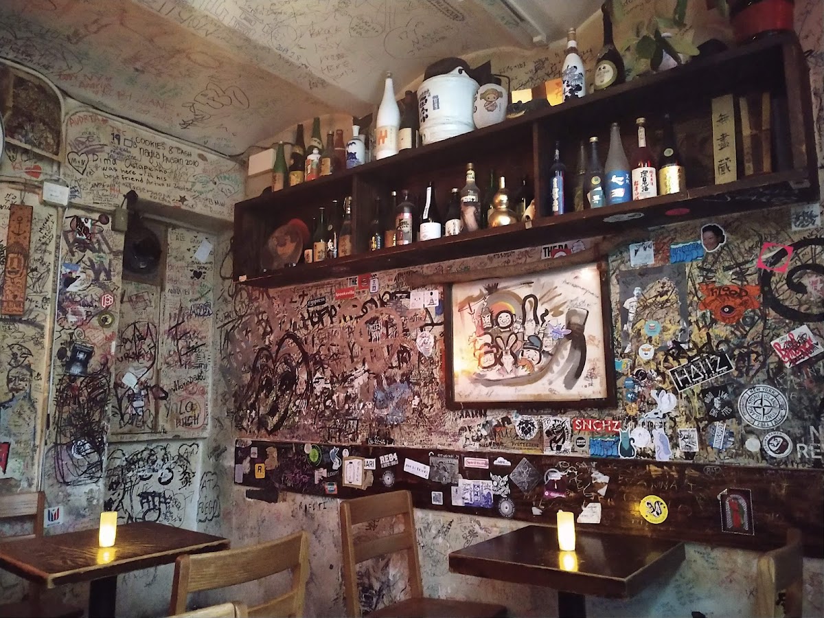 We visited on a Friday night around 11:50 pm and, even as walk-ins, only waited about five minutes for a table for three. The place was super cozy and packed with people, adding to its lively vibe. They offer food, but we decided to just share a bottle of sake. The atmosphere was incredible, with a warm, inviting feel that made it seem like we'd stepped into a traditional Japanese hangout spot. The walls were covered with vibrant drawings and stickers, adding to the unique ambiance. Despite being busy, the service was attentive, with staff frequently refilling our water, which we appreciated.